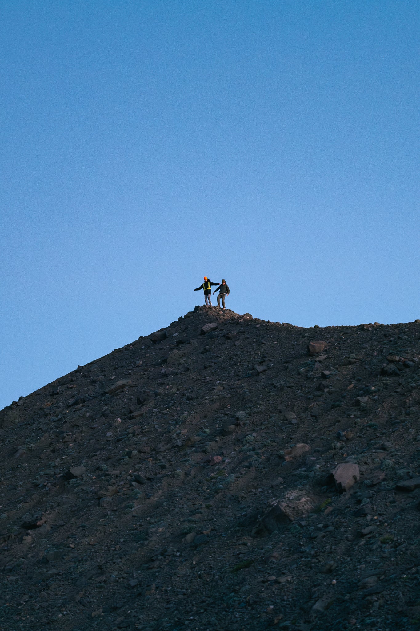 Two hikers stand silhouetted on a scree slope before dawn, arms outstretched to the sky. Professionally printed on Fujifilm Crystal Archive Lustre Paper.
