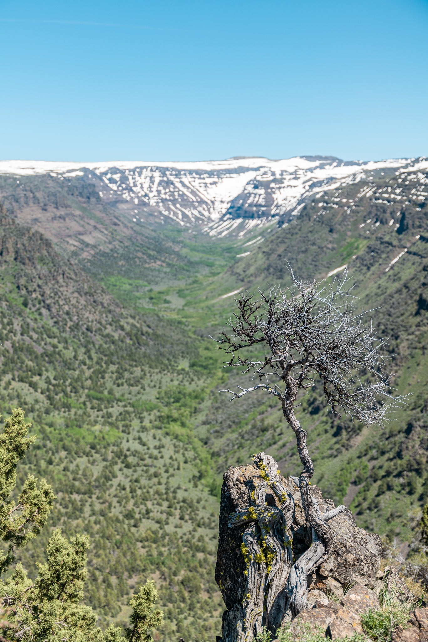 A gnarled tree clings to a basalt outcrop above SE Oregon's Big Indian Gorge, standing resilient against time and wind. In the distance, snow crowns the summit of Steens Mountain, where alpine cliffs meet the silence of desert canyons. Professionally printed on Fujifilm Crystal Archive Lustre Paper.