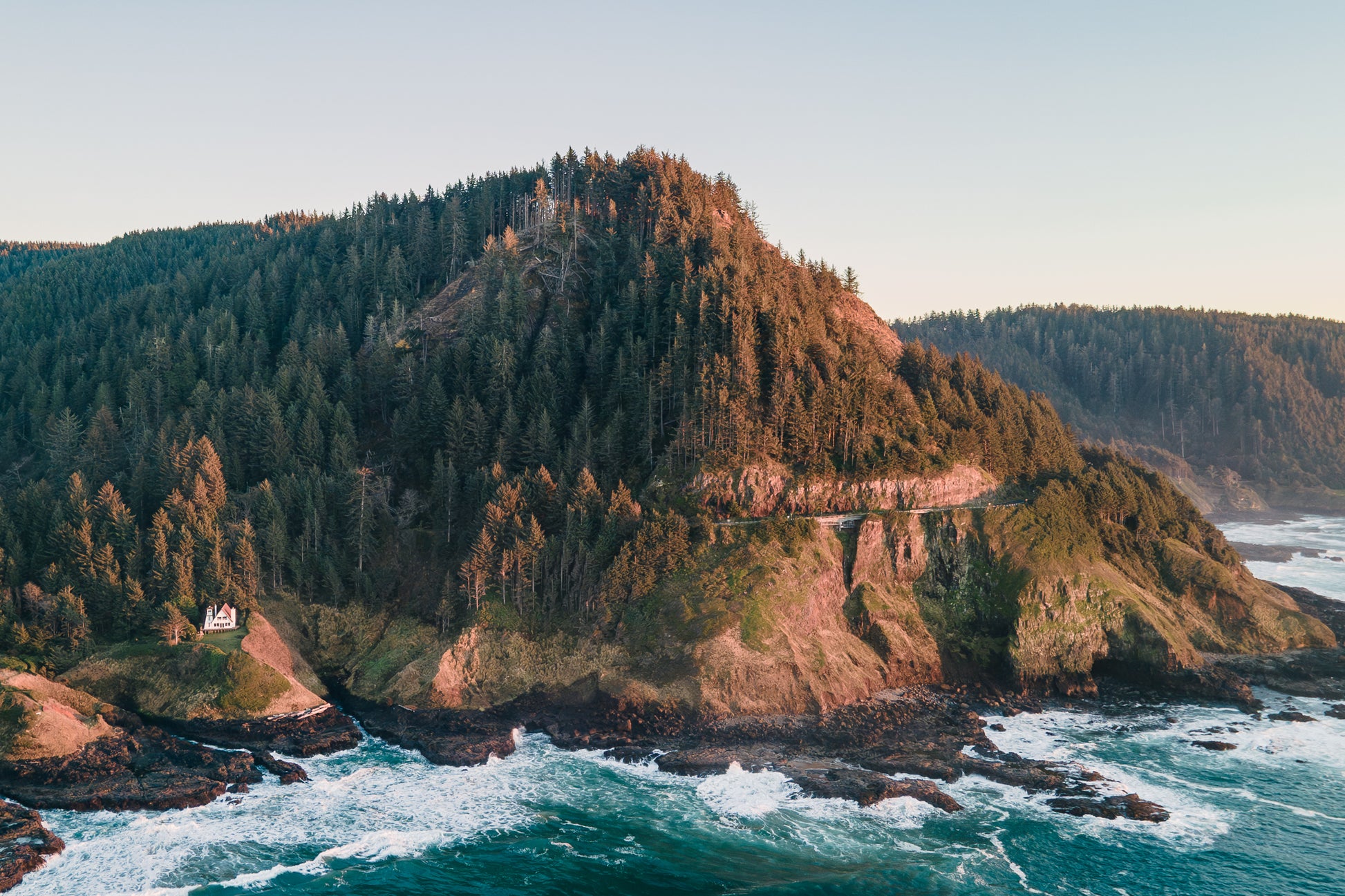 Cape Perpetua rises steeply from the Pacific Ocean in this golden hour aerial, where the Cleft of the Rock Lighthouse watches over the waves below. Professionally printed on Fujifilm Crystal Archive Lustre Paper.