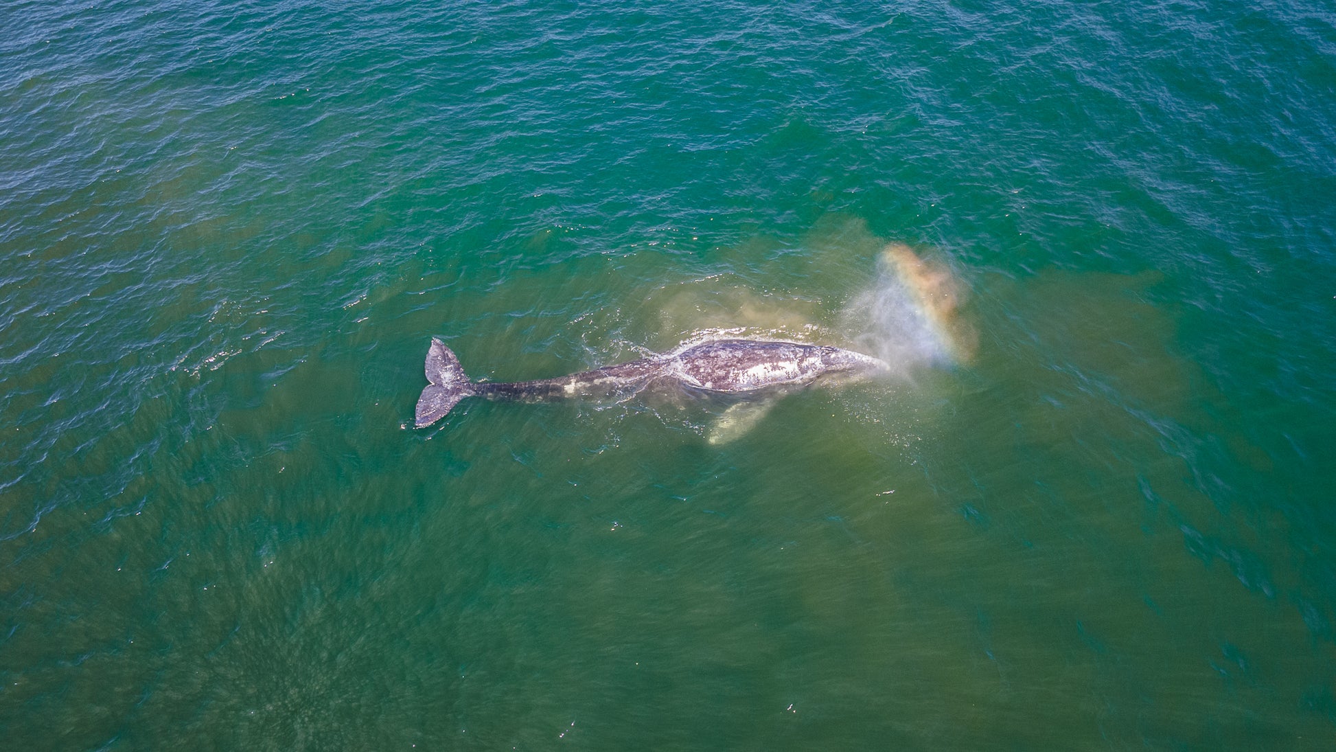 A lone gray whale rises near the Oregon Coast, its breath catching the midday sun just long enough to cast a fleeting rainbow across the sea. Professionally printed on Fujifilm Crystal Archive Lustre Paper.