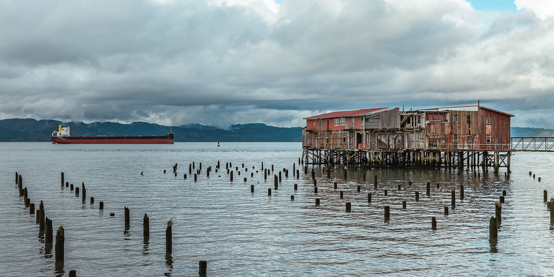 Weathered wood and rusted pilings stretch toward a distant freighter in this view of Astoria's maritime heritage. The red shack, perched on stilts above the Columbia River, once part of a bustling fishing industry, now leans quietly against the wind, watching the ships go by. Professionally printed on Fujifilm Crystal Archive Lustre Paper.