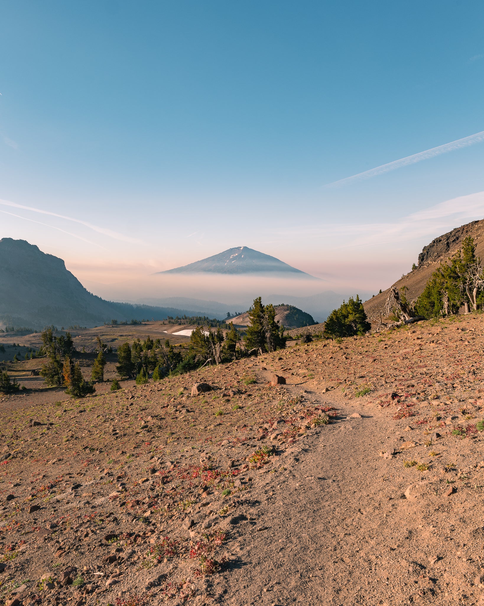 Looking south toward Mt. Bachelor from the shoulder of Broken Top, a faint trail leads through dusty volcanic soil, framed by hardy alpine trees and early morning light on the distant peak. Professionally printed on Fujifilm Crystal Archive Lustre Paper.