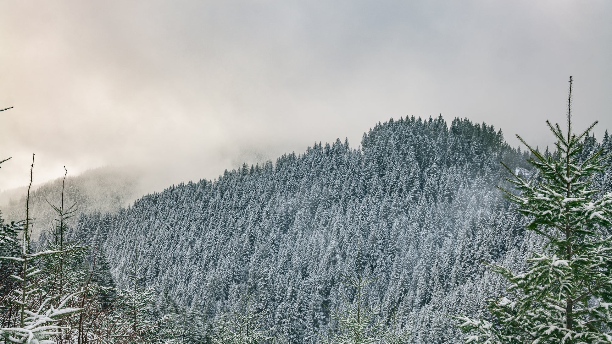 Snow coats the firs of a quiet Coast Range ridge, where fog clings to the treetops and dawn lighting warms the clouds. Professionally printed on Fujifilm Crystal Archive Lustre Paper.